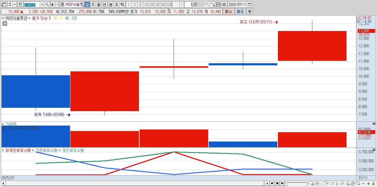 - 싸이닉솔루션 (13,000원 ▲ 20.93% , 시총: 3,069억, 외국인 순매수 거래금:81억)