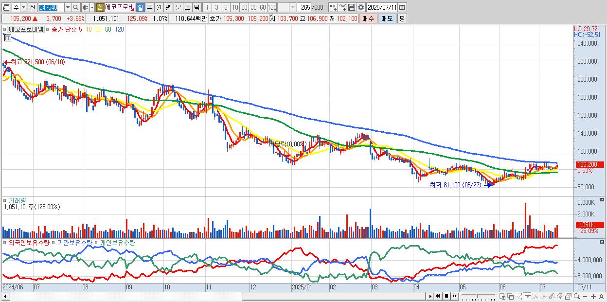 - 에코프로비엠 (105,200원 ▲ 3.65% , 시총: 102,887억, 외국인 순매수 거래금:80억)