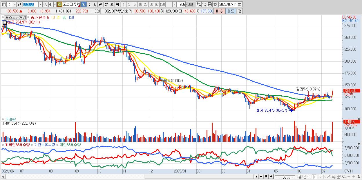 - 포스코퓨처엠 (139,000원 ▲ 7.34% , 시총: 107,674억, 외국인 순매수 거래금:245억)