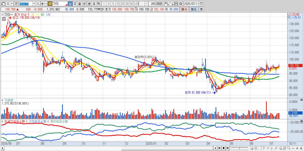 - 기아 (100,800원 ▲ 0.7% , 시총: 400,854억, 외국인 순매수 거래금:395억)