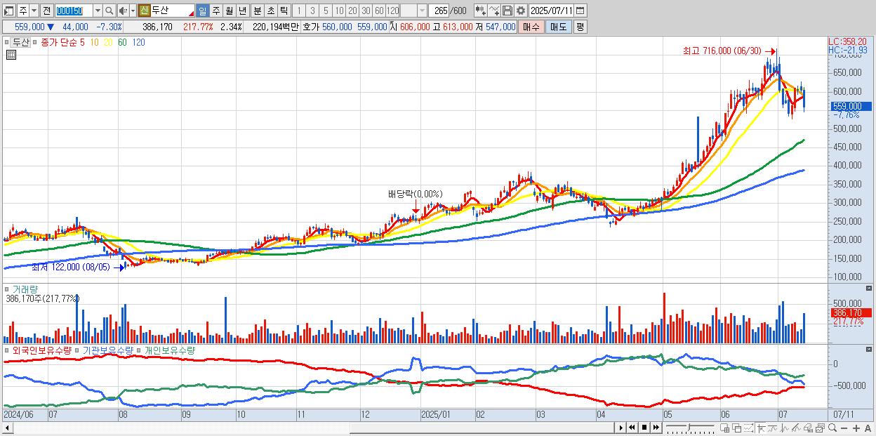 - 두산 (559,000원 ▼ -7.3% , 시총: 92,368억, 외국인 순매수 거래금:221억)