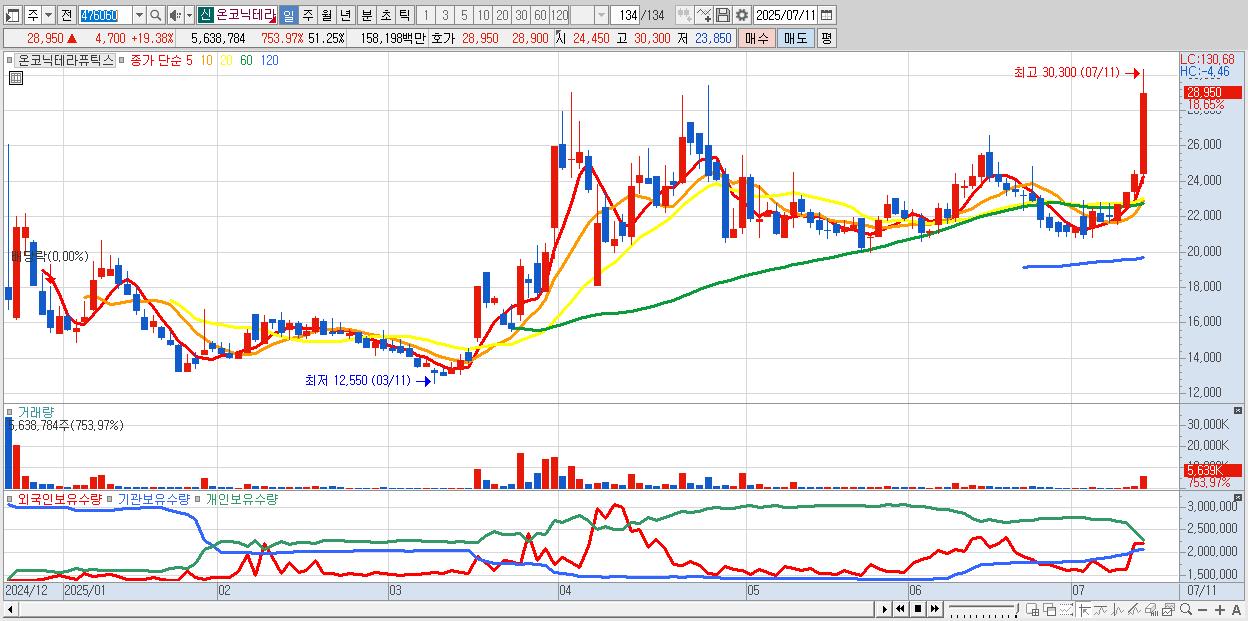 - 온코닉테라퓨틱스 (28,250원 ▲ 16.49% , 시총: 3,108억, 외국인 순매수 거래금:78억)