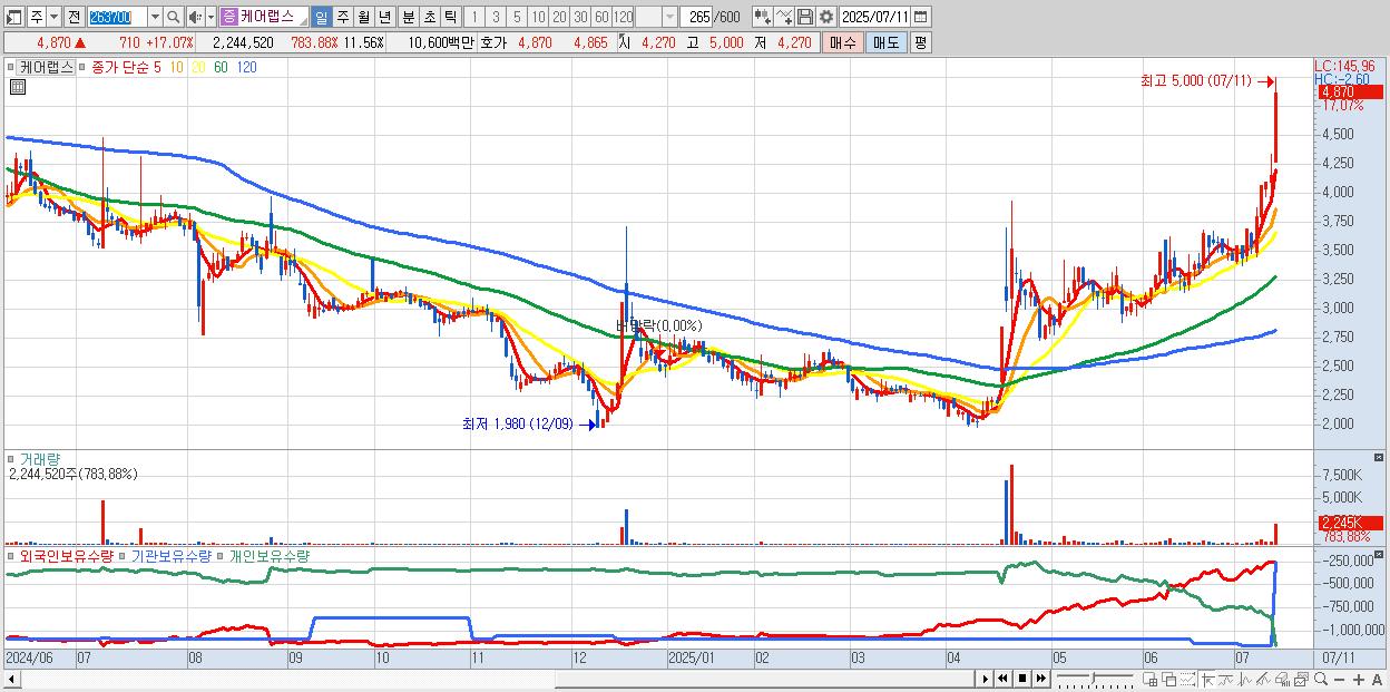 - 케어랩스 (4,870원 ▲ 17.07% , 시총: 945억, 거래량: 2,244,520, 거래대금:106억, KOSDAQ)