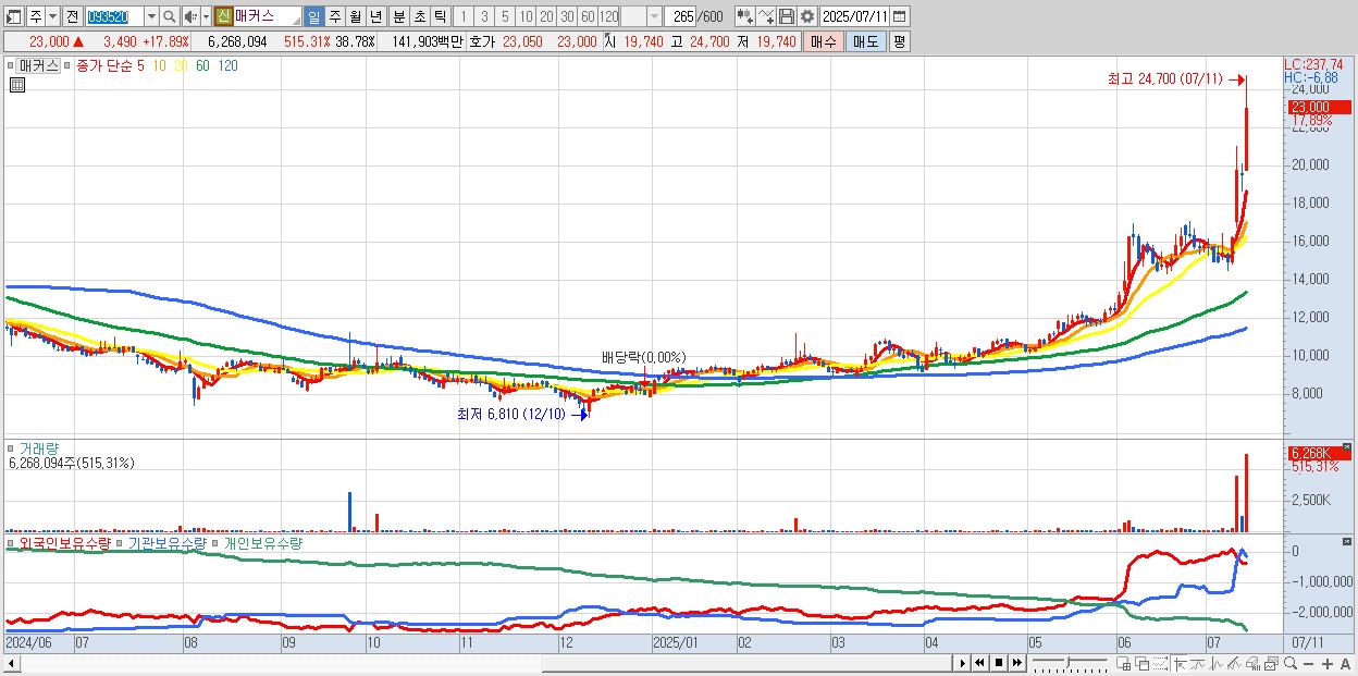 - 매커스 (23,000원 ▲ 17.89% , 시총: 3,718억, 거래량: 6,268,094, 거래대금:1,419억, KOSDAQ)