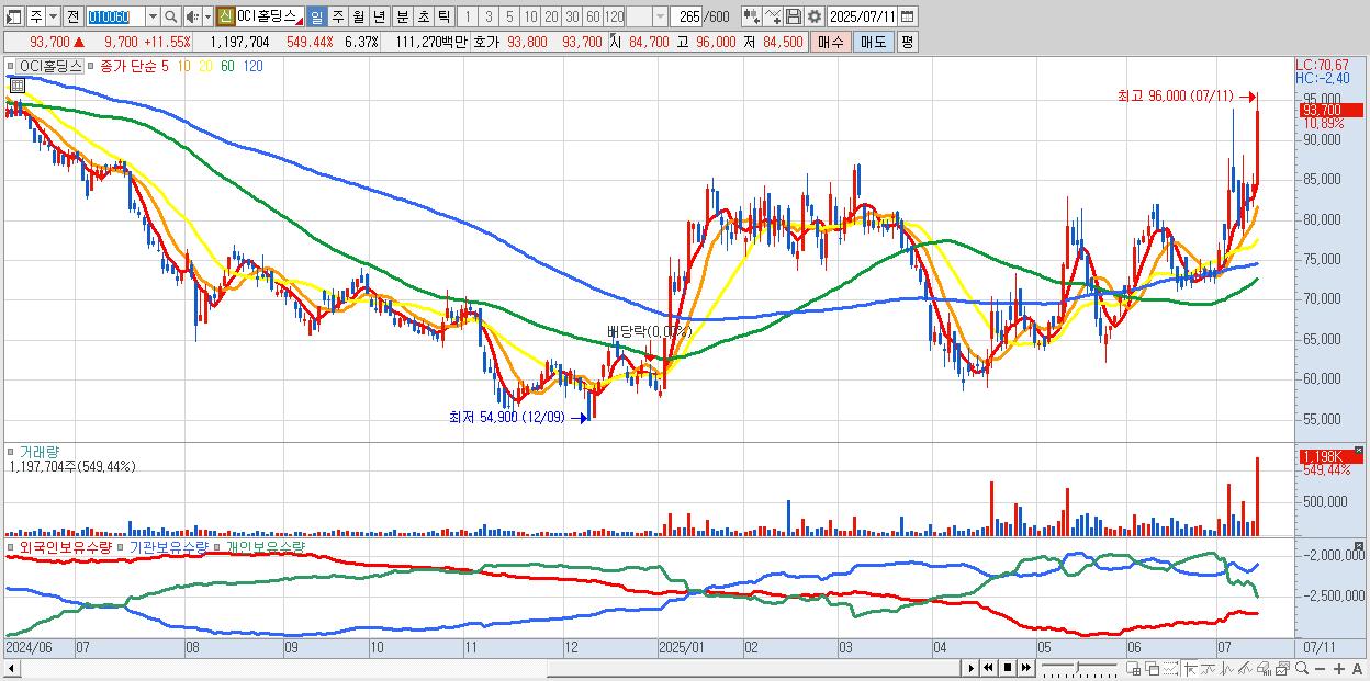 - OCI홀딩스 (94,000원 ▲ 11.9% , 시총: 17,686억, 거래량: 743,879, 거래대금:692억, KOSPI)
