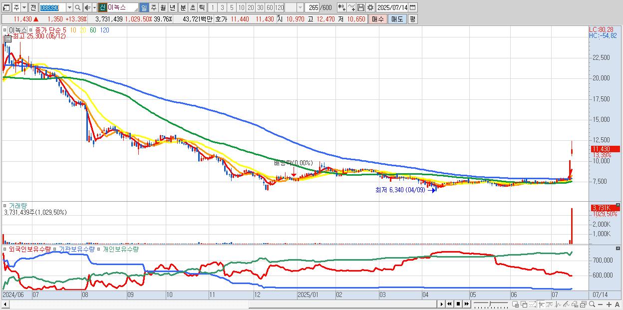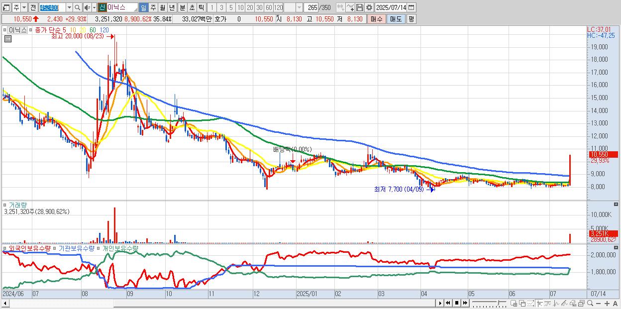 - 이닉스 (10,550원 ▲ 29.93% , 시총: 957억, 거래량: 3,251,320, 거래대금:330억)