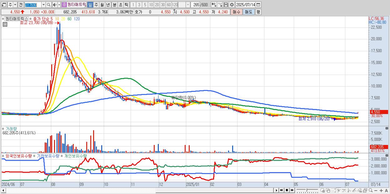 - 퀀타매트릭스 (4,550원 ▲ 30% , 시총: 826억, 거래량: 682,205, 거래대금:31억)