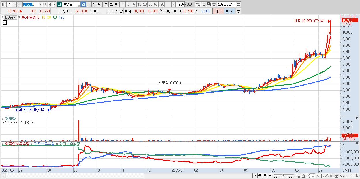 - DB증권 (10,960원 ▲ 9.27% , 시총: 4,652억, 거래량: 872,261, 거래대금:91억)