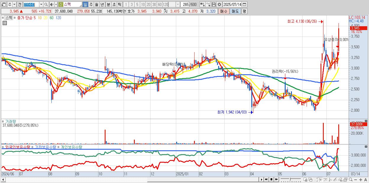 - 스맥 (3,945원 ▲ 16.72% , 시총: 2,692억, 거래량: 37,688,048, 거래대금:1,451억)