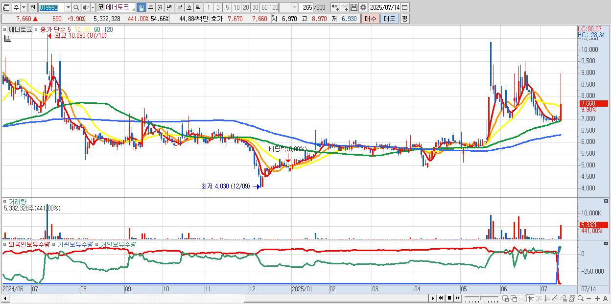 - 에너토크 (7,660원 ▲ 9.9% , 시총: 747억, 거래량: 5,332,328, 거래대금:449억)