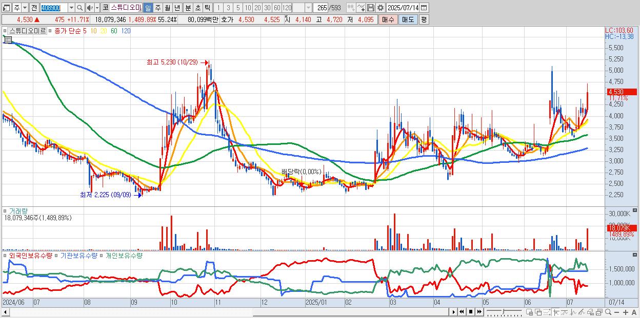 - 스튜디오미르 (4,530원 ▲ 11.71% , 시총: 1,483억, 거래량: 18,079,346, 거래대금:801억)