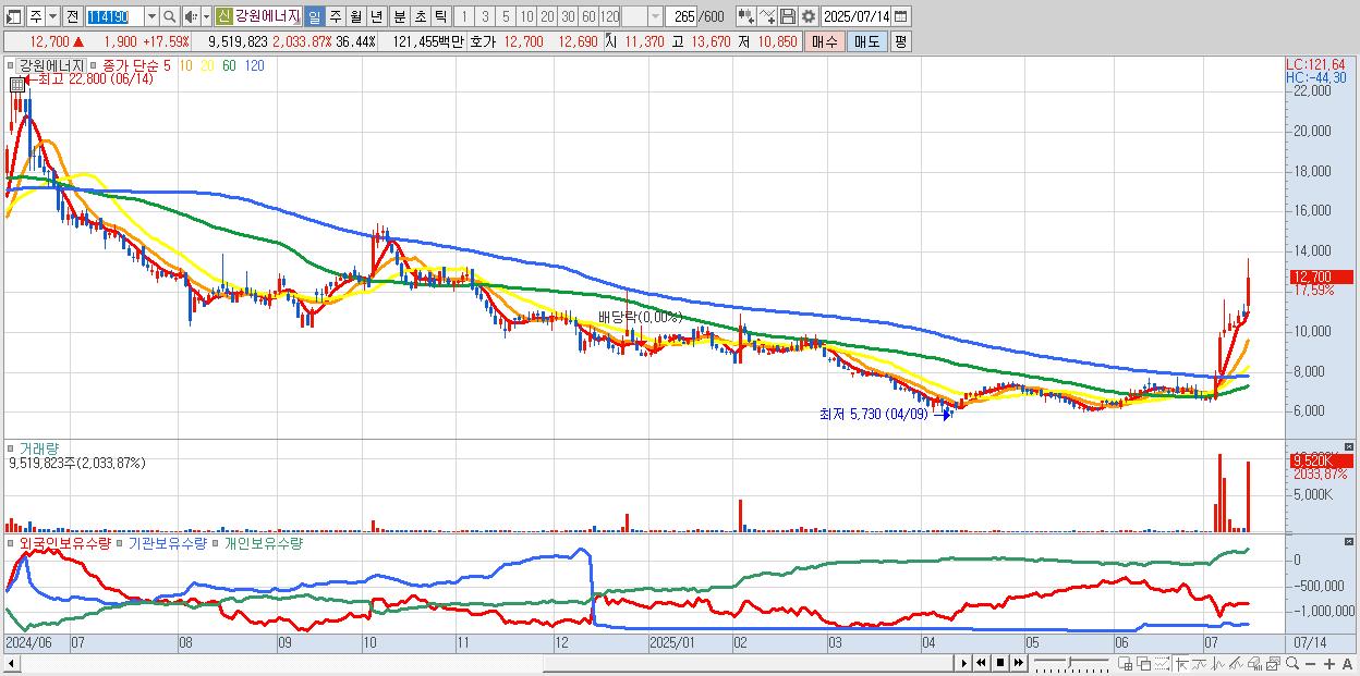 - 강원에너지 (12,700원 ▲ 17.59% , 시총: 3,318억, 거래량: 9,519,823, 거래대금:1,215억)
