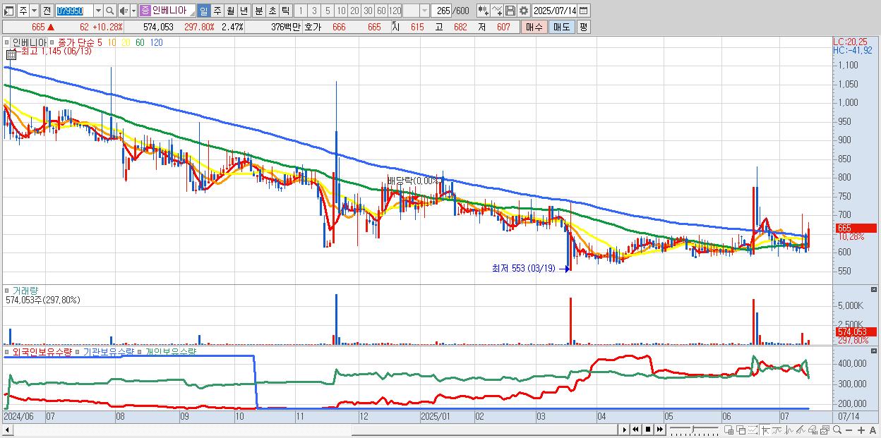 - 인베니아 (665원 ▲ 10.28% , 시총: 154억, 거래량: 574,053, 거래대금:4억)