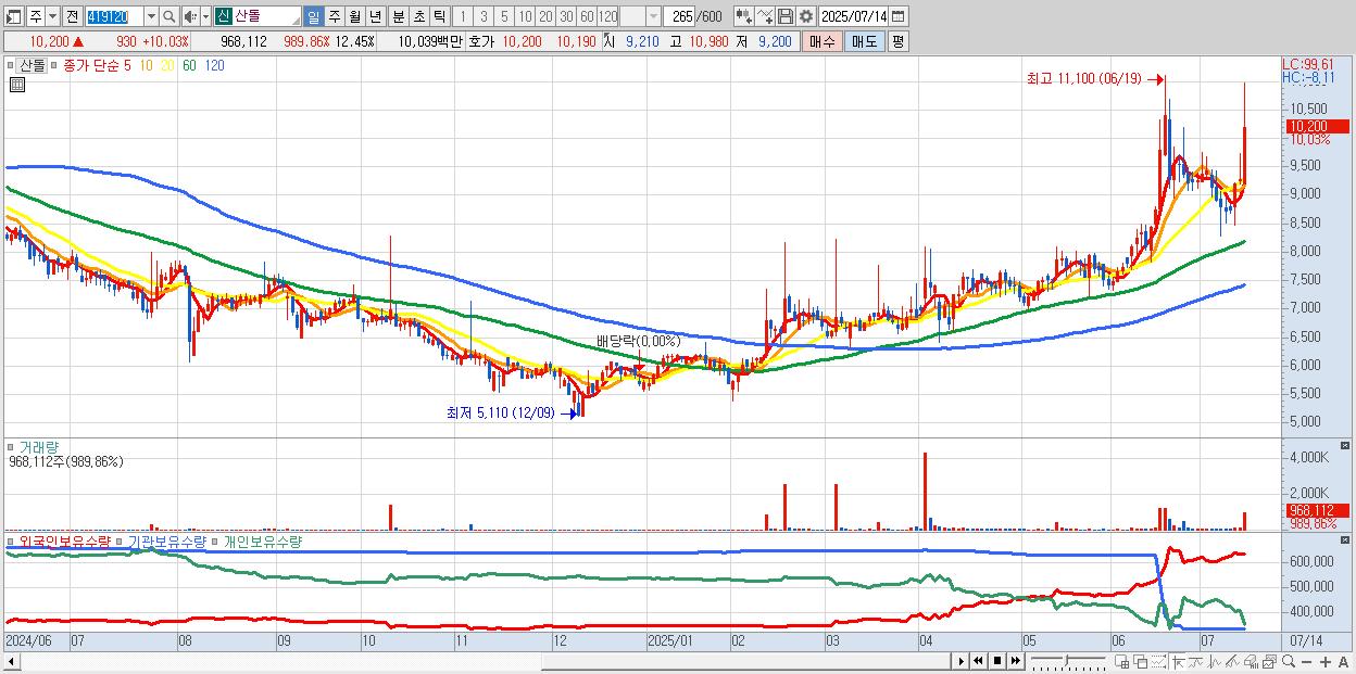 - 산돌 (10,200원 ▲ 10.03% , 시총: 793억, 거래량: 968,112, 거래대금:100억)