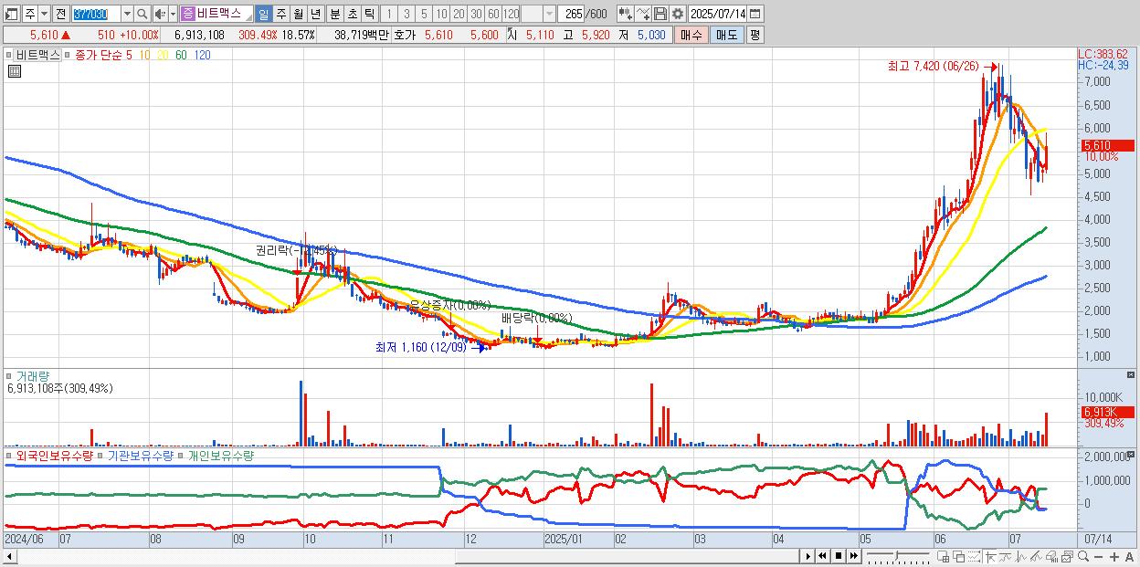 - 비트맥스 (5,610원 ▲ 10% , 시총: 2,089억, 거래량: 6,913,108, 거래대금:387억)