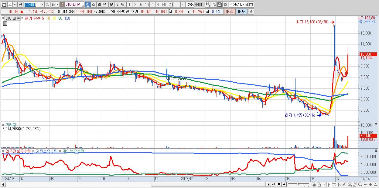 - 에이비온 (10,060원 ▲ 17.11% , 시총: 2,881억, 거래량: 8,014,366, 거래대금:797억)