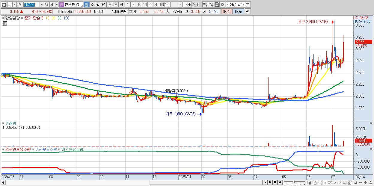 - 한일철강 (3,155원 ▲ 14.94% , 시총: 842억, 거래량: 1,565,450, 거래대금:49억)