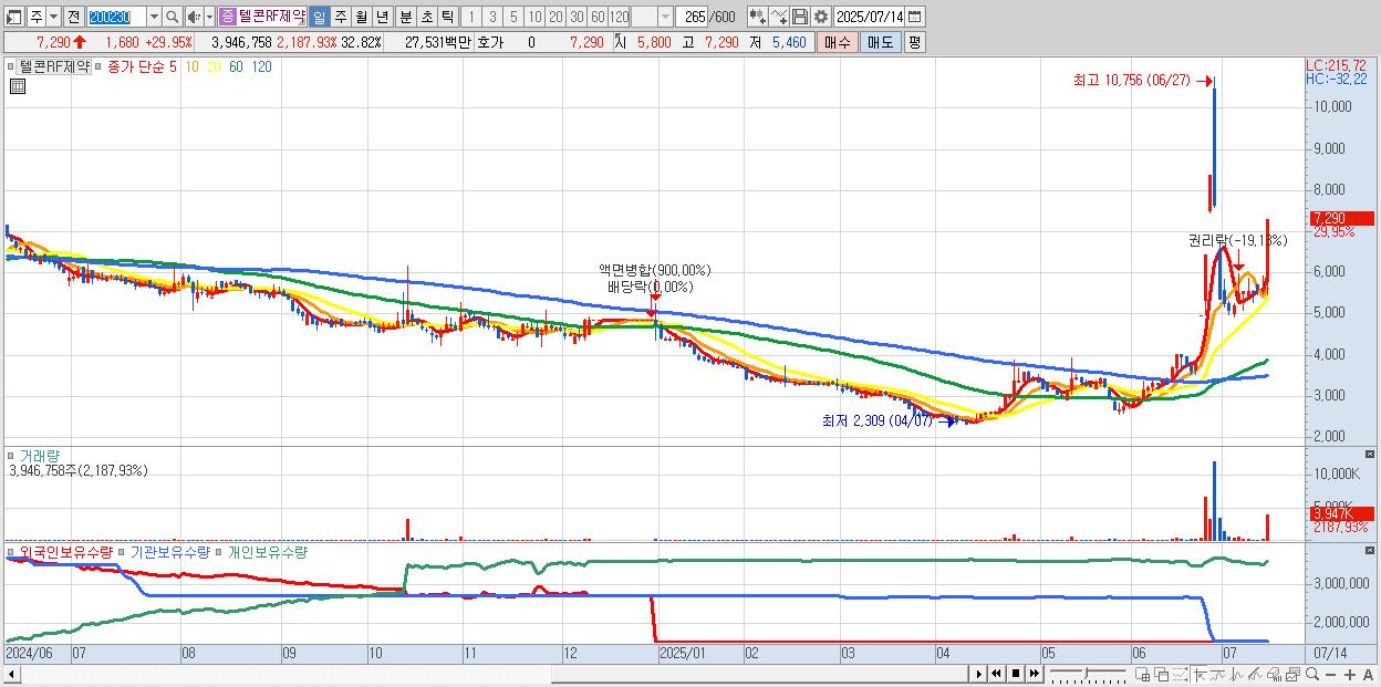 - 텔콘RF제약 (7,290원 ▲ 29.95% , 시총: 877억, 거래량: 3,946,758, 거래대금:275억)