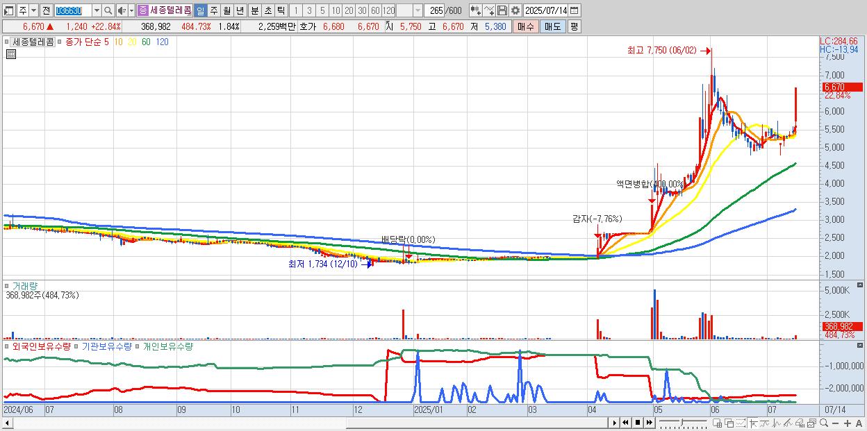 - 세종텔레콤 (6,670원 ▲ 22.84% , 시총: 1,334억, 거래량: 368,982, 거래대금:23억)