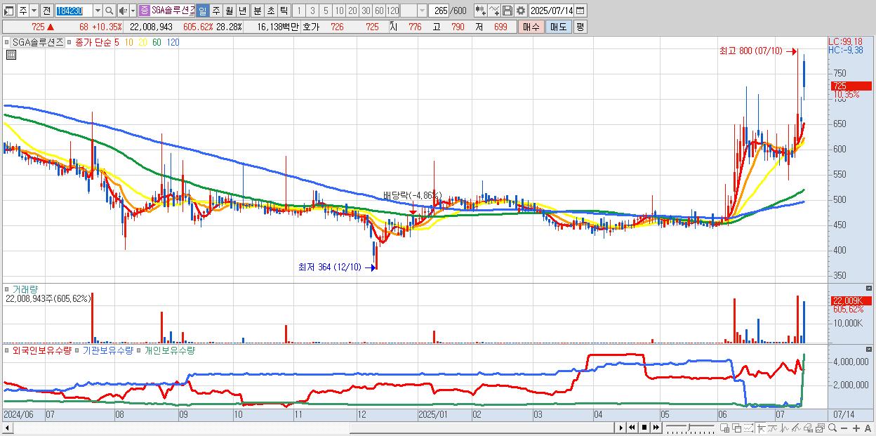 - SGA솔루션즈 (725원 ▲ 10.35% , 시총: 564억, 거래량: 22,008,943, 거래대금:161억)