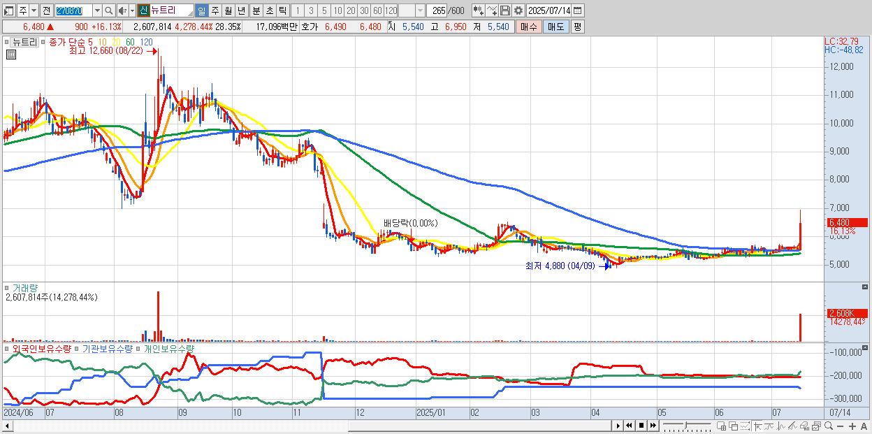 - 뉴트리 (6,480원 ▲ 16.13% , 시총: 596억, 거래량: 2,607,814, 거래대금:171억)