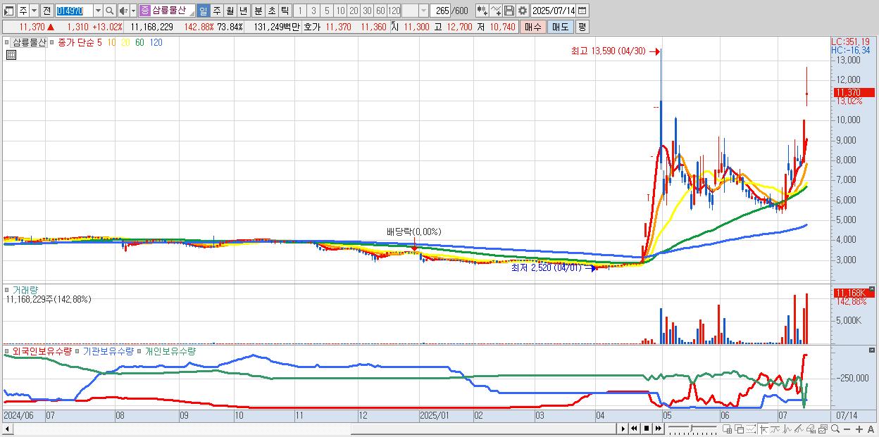 - 삼륭물산 (11,370원 ▲ 13.02% , 시총: 1,720억, 거래량: 11,168,229, 거래대금:1,312억)