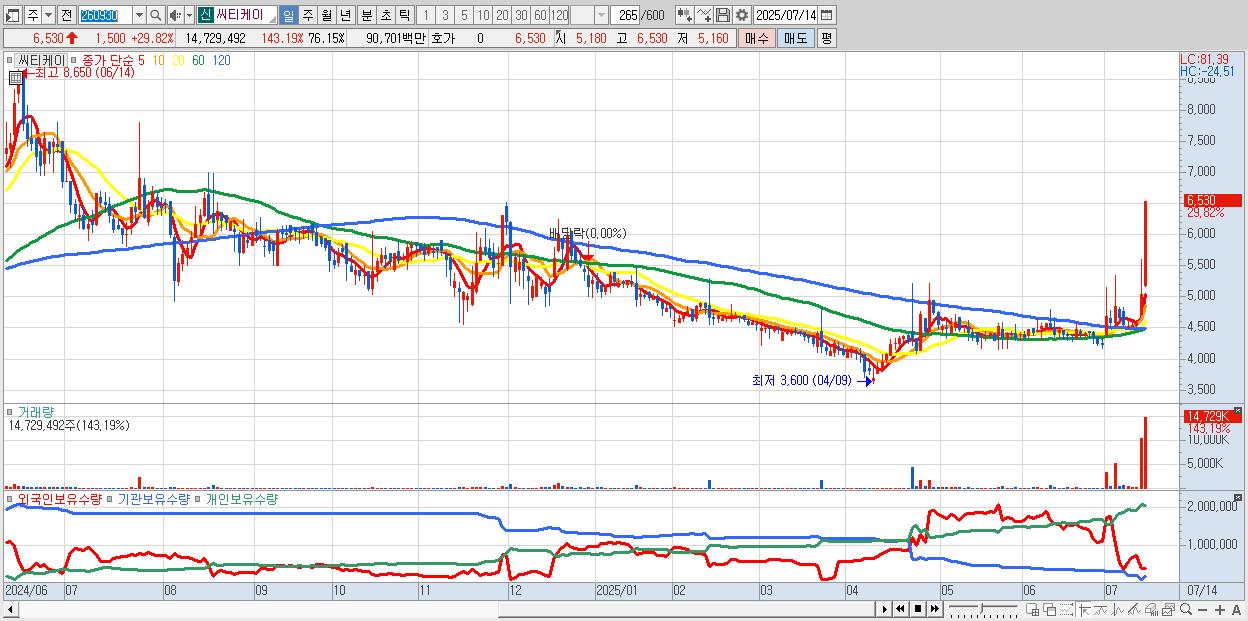 - 씨티케이 (6,530원 ▲ 29.82% , 시총: 1,263억, 거래량: 14,729,492, 거래대금:907억)