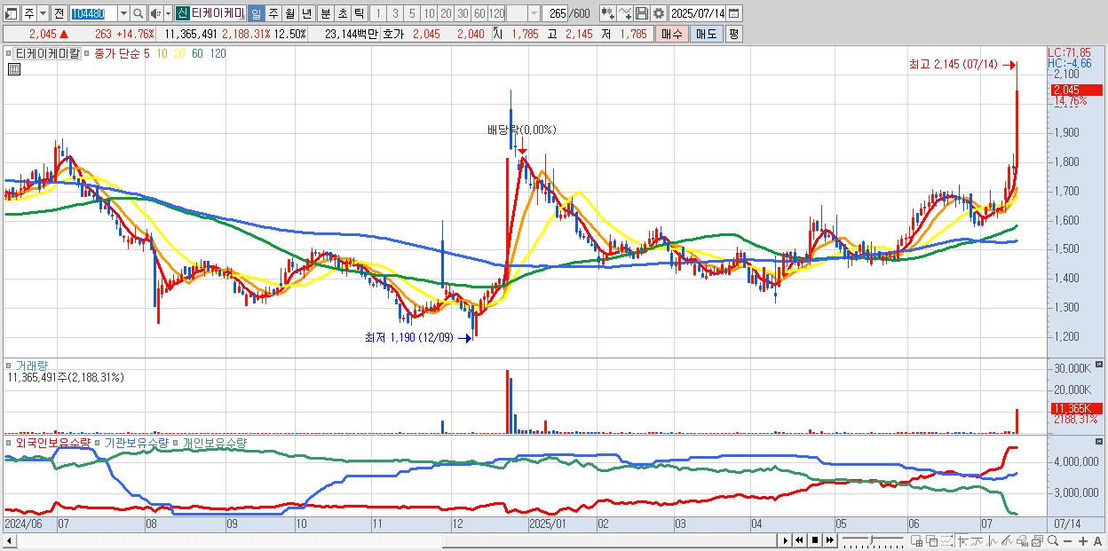 - 티케이케미칼 (2,045원 ▲ 14.76% , 시총: 1,859억, 거래량: 11,365,491, 거래대금:231억)