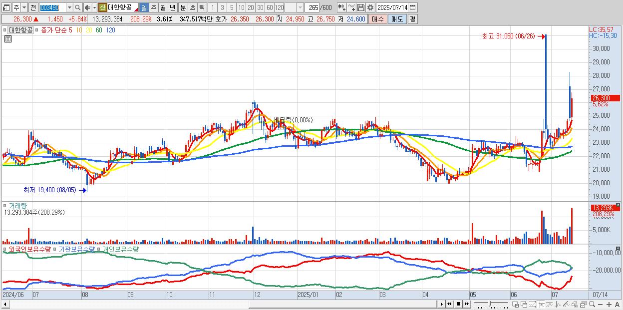 - 대한항공 (26,250원 ▲ 5.63% , 시총: 96,658억, 외국인 순매수 거래금:227억)