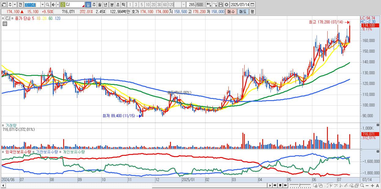 - CJ (174,900원 ▲ 10% , 시총: 51,031억, 외국인 순매수 거래금:143억)