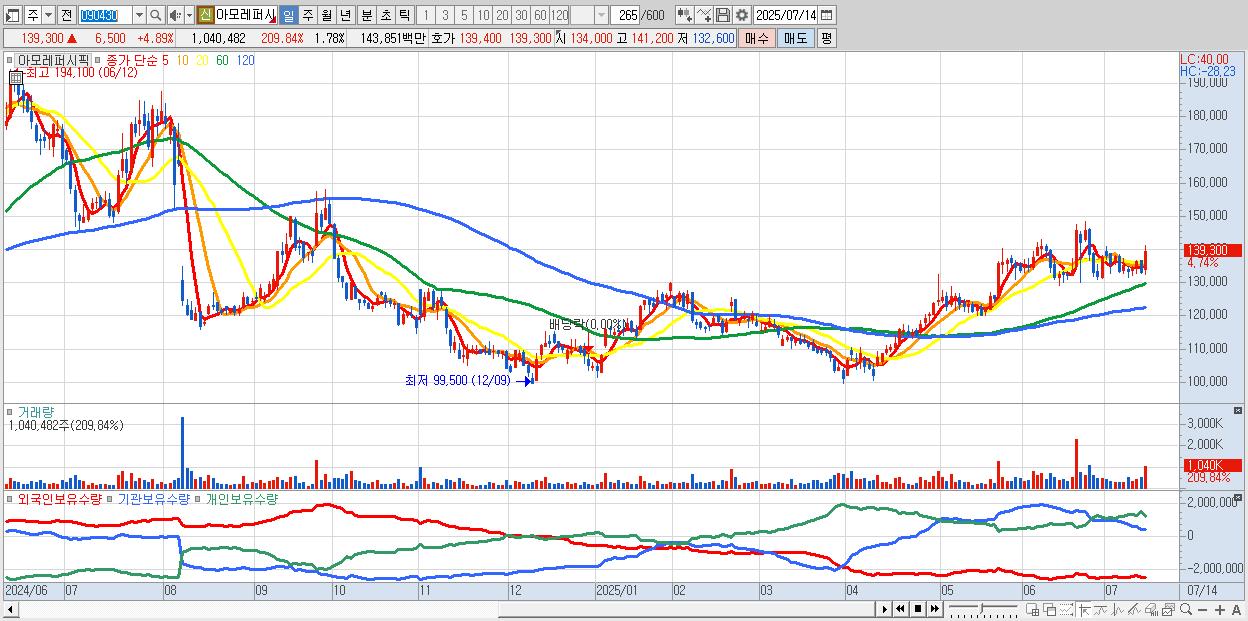 - 아모레퍼시픽 (139,600원 ▲ 5.12% , 시총: 81,656억, 외국인 순매수 거래금:323억)