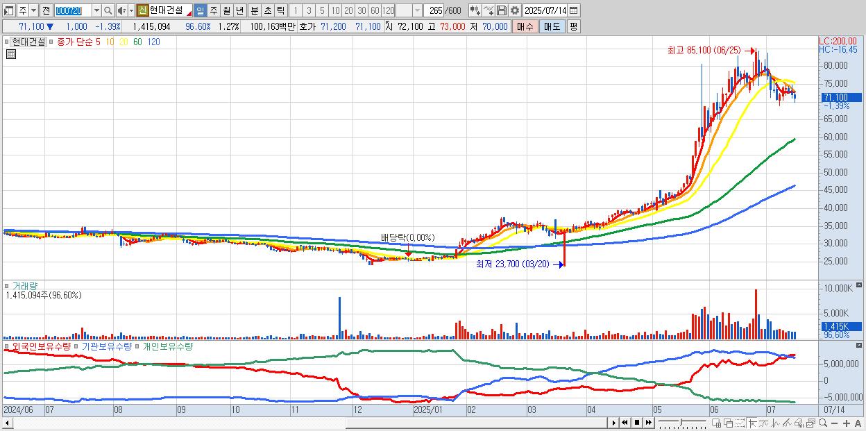 - 현대건설 (71,200원 ▼ -1.25% , 시총: 79,285억, 외국인 순매수 거래금:232억)