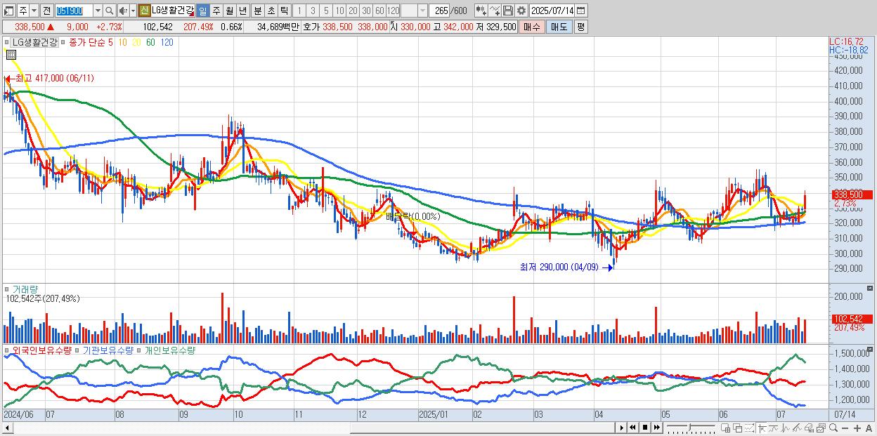 - LG생활건강 (339,000원 ▲ 2.88% , 시총: 52,946억, 외국인 순매수 거래금:74억)