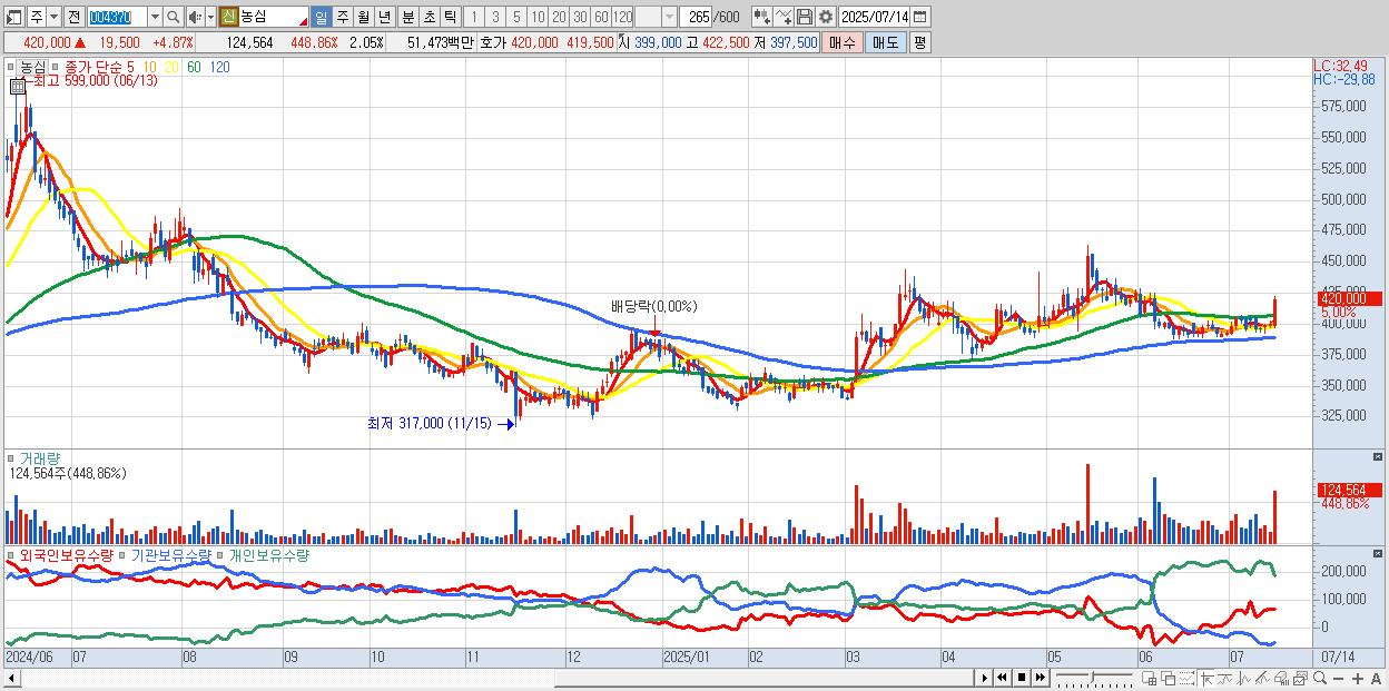 - 농심 (420,500원 ▲ 4.99% , 시총: 25,578억, 외국인 순매수 거래금:169억)