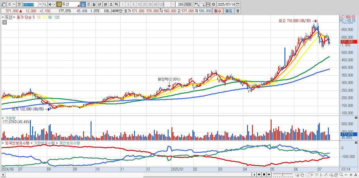- 두산 (571,000원 ▲ 2.15% , 시총: 94,351억, 외국인 순매수 거래금:92억)