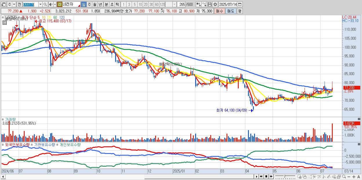 - LG전자 (77,200원 ▲ 2.52% , 시총: 126,336억, 외국인 순매수 거래금:70억)