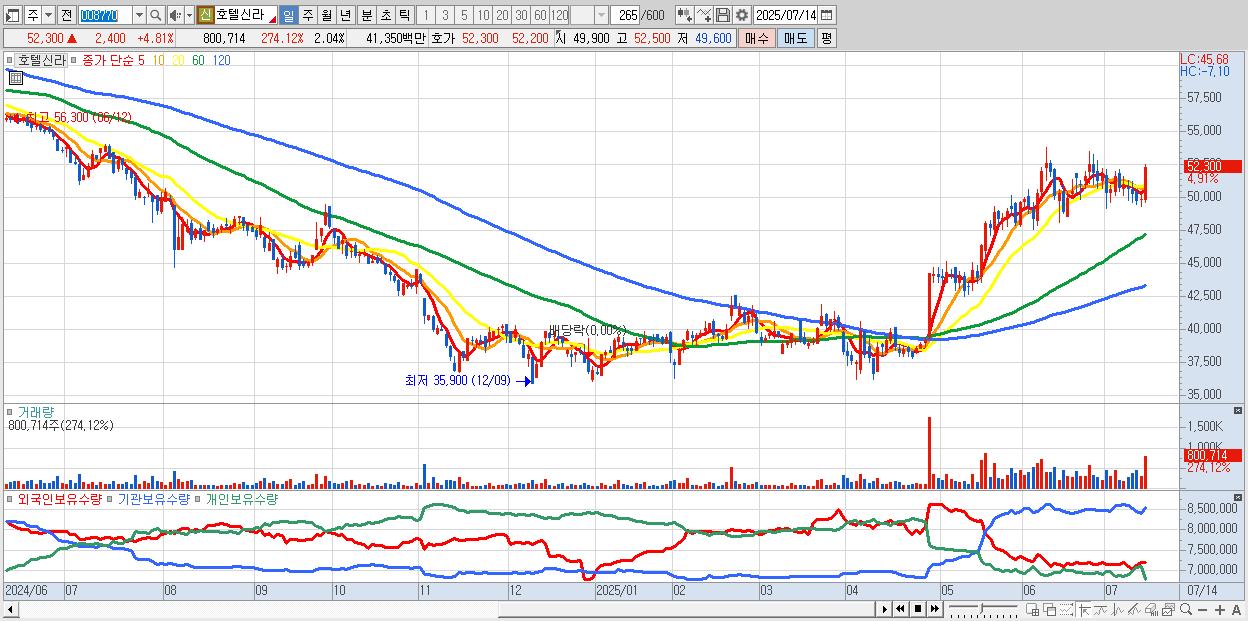 - 호텔신라 (52,300원 ▲ 4.81% , 시총: 20,527억, 외국인 순매수 거래금:91억)