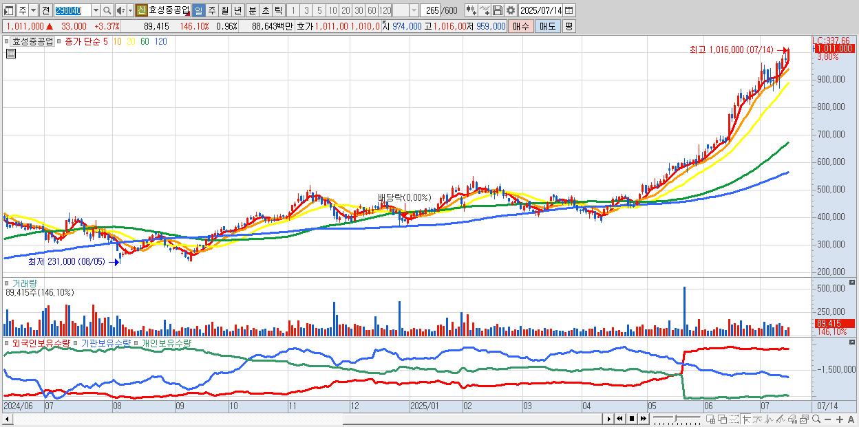 - 효성중공업 (1,008,000원 ▲ 3.07% , 시총: 93,991억, 외국인 순매수 거래금:188억)