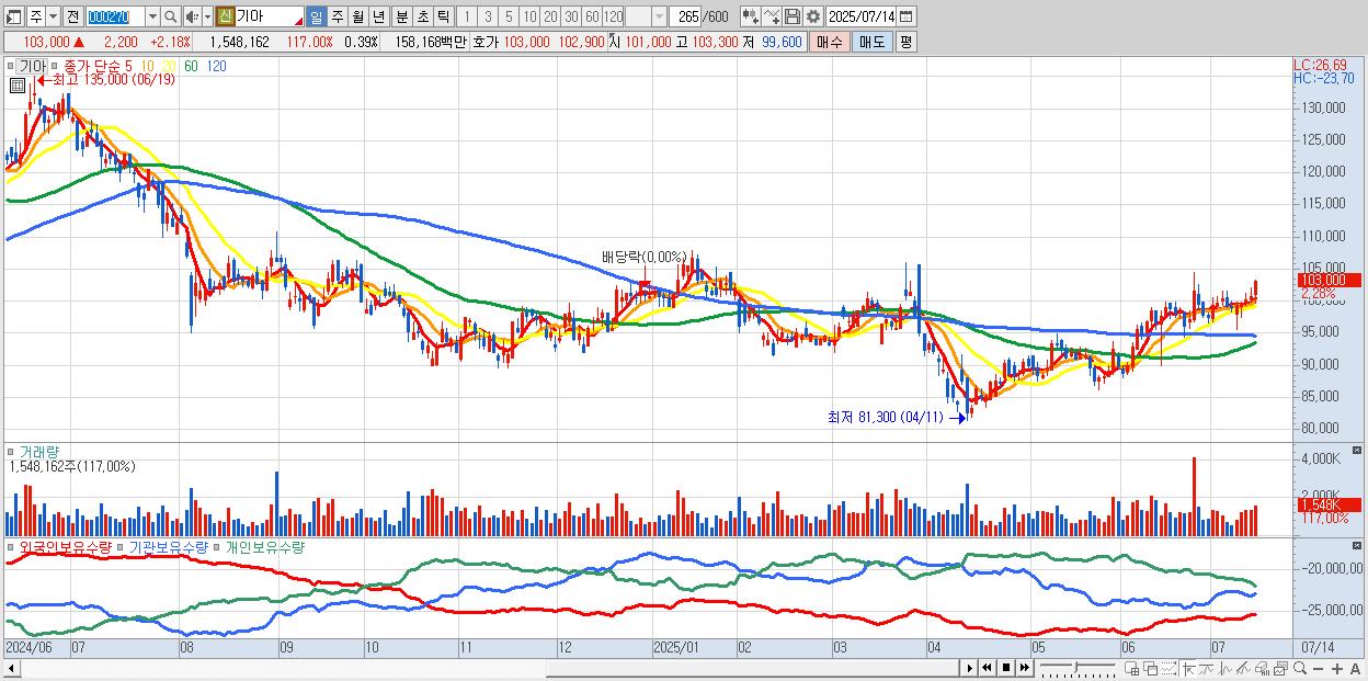 - 기아 (103,000원 ▲ 2.18% , 시총: 409,603억, 외국인 순매수 거래금:193억)