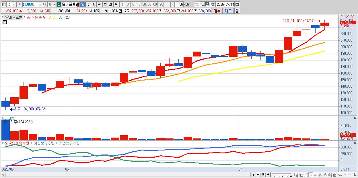 - 달바글로벌 (238,000원 ▲ 3.48% , 시총: 28,801억, 외국인 순매수 거래금:102억)