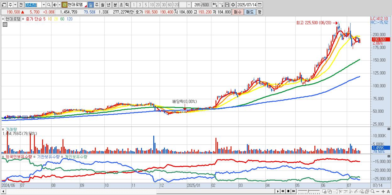- 현대로템 (191,000원 ▲ 3.35% , 시총: 208,462억, 외국인 순매수 거래금:527억)