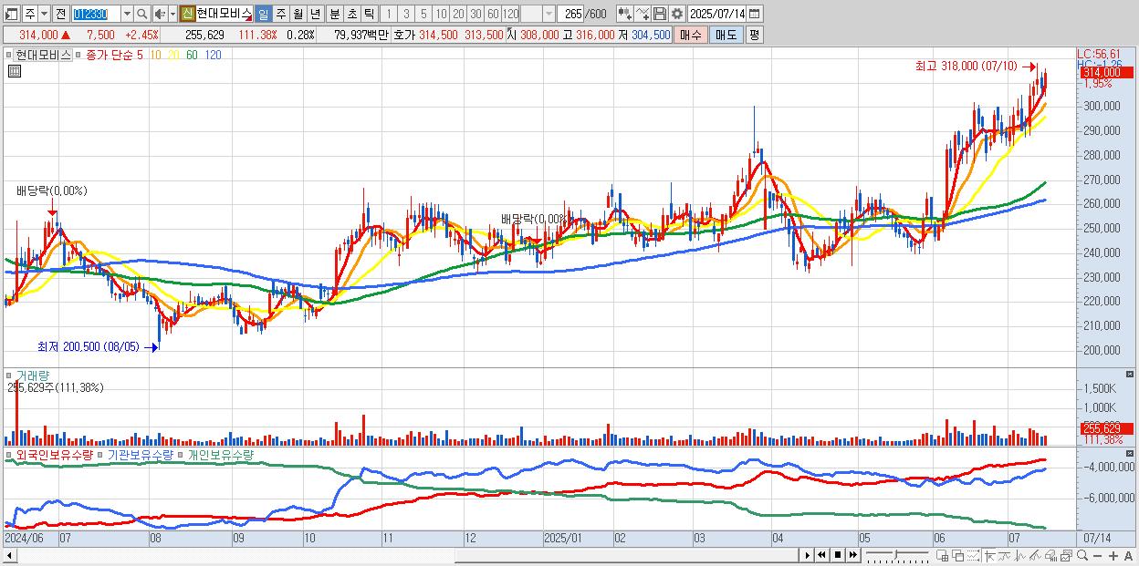 - 현대모비스 (314,500원 ▲ 2.61% , 시총: 288,696억, 외국인 순매수 거래금:58억)
