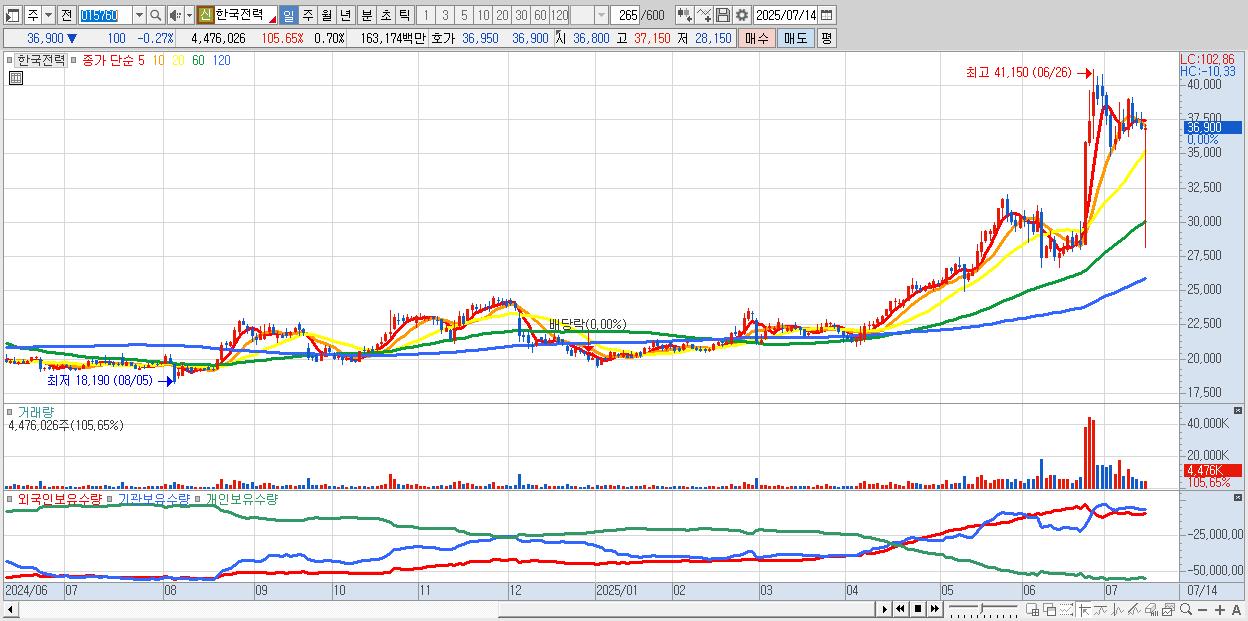 - 한국전력 (36,950원 ▼ -0.14% , 시총: 237,206억, 외국인 순매수 거래금:104억)
