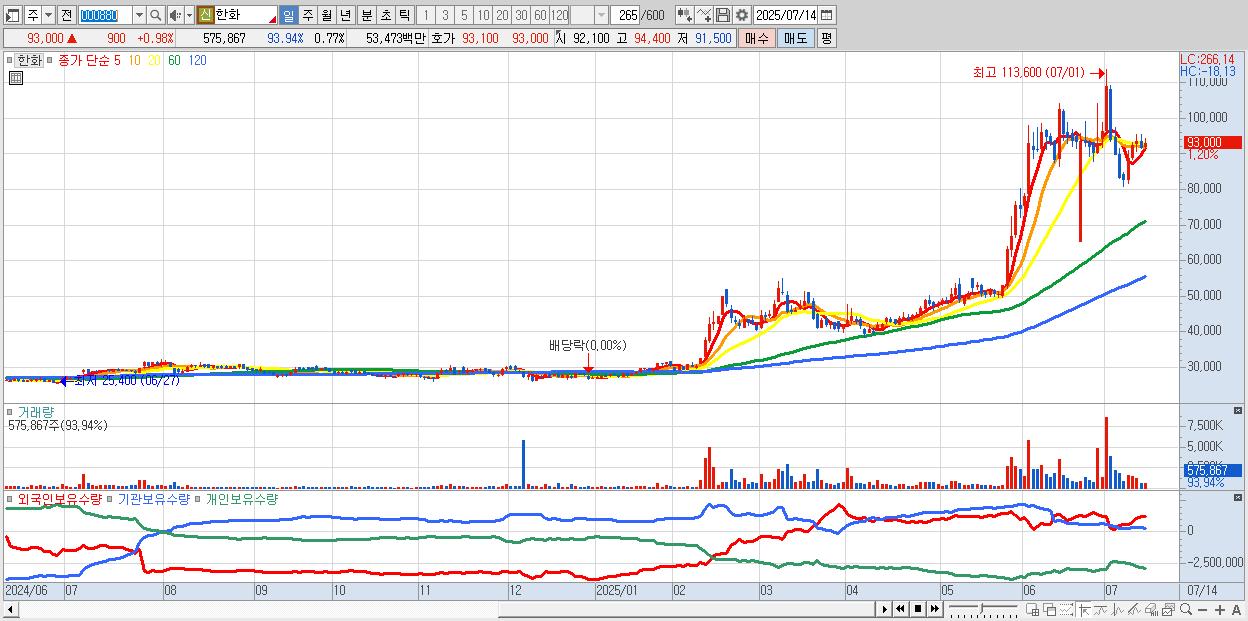 - 한화 (93,000원 ▲ 0.98% , 시총: 69,712억, 외국인 순매수 거래금:94억)