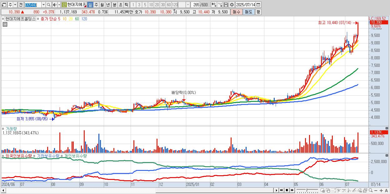 - 현대지에프홀딩스 (10,440원 ▲ 9.89% , 시총: 16,276억, 거래량: 786,334, 거래대금:79억, KOSPI)