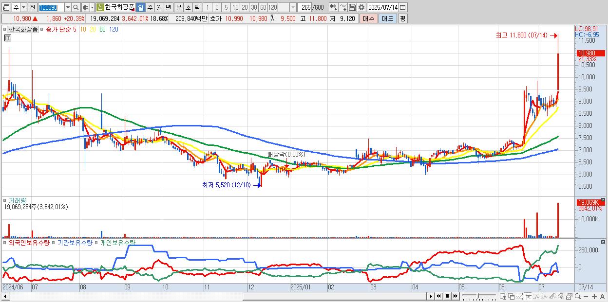 - 한국화장품 (10,980원 ▲ 20.39% , 시총: 1,764억, 거래량: 6,922,181, 거래대금:774억, KOSPI)