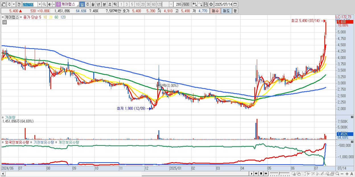 - 케어랩스 (5,400원 ▲ 10.88% , 시총: 1,048억, 거래량: 1,451,896, 거래대금:76억, KOSDAQ)