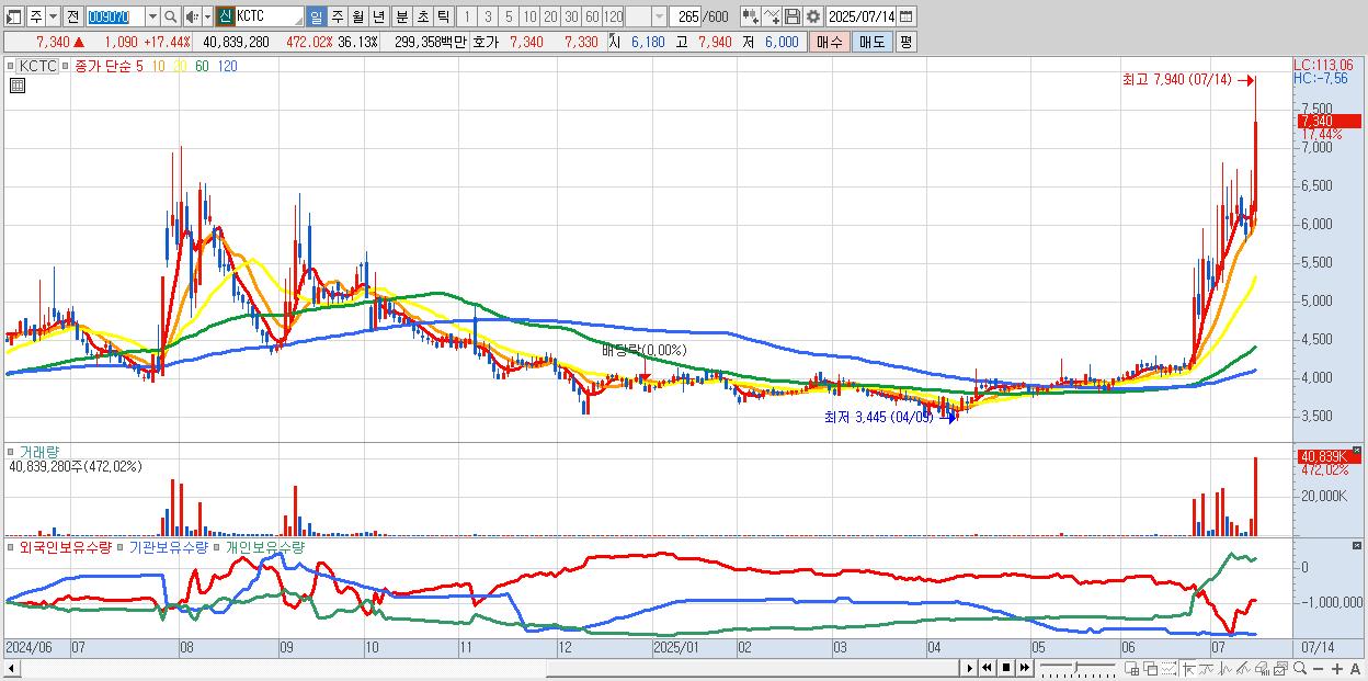 - KCTC (7,340원 ▲ 17.44% , 시총: 2,202억, 거래량: 40,839,280, 거래대금:2,994억, KOSPI)