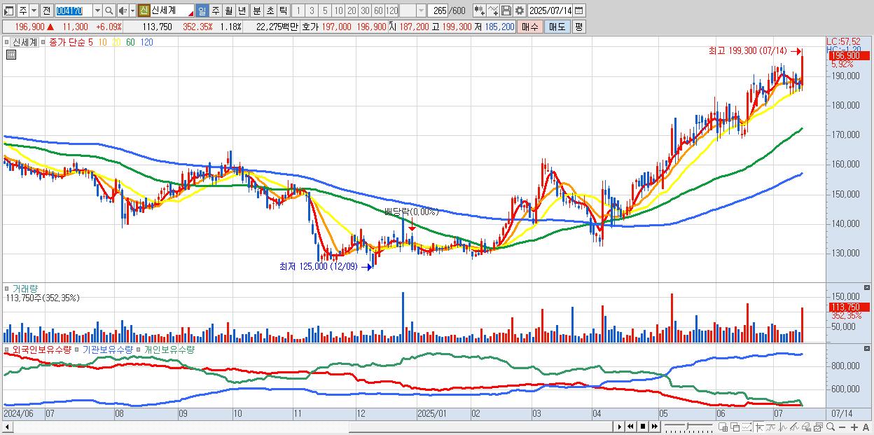 - 신세계 (197,800원 ▲ 6.57% , 시총: 19,078억, 거래량: 91,738, 거래대금:180억, KOSPI)