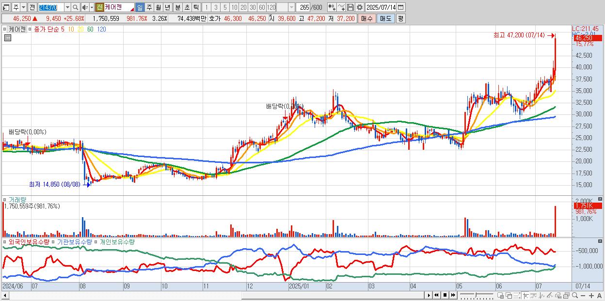 - 케어젠 (43,000원 ▲ 16.85% , 시총: 23,097억, 거래량: 715,750, 거래대금:296억, KOSDAQ)
